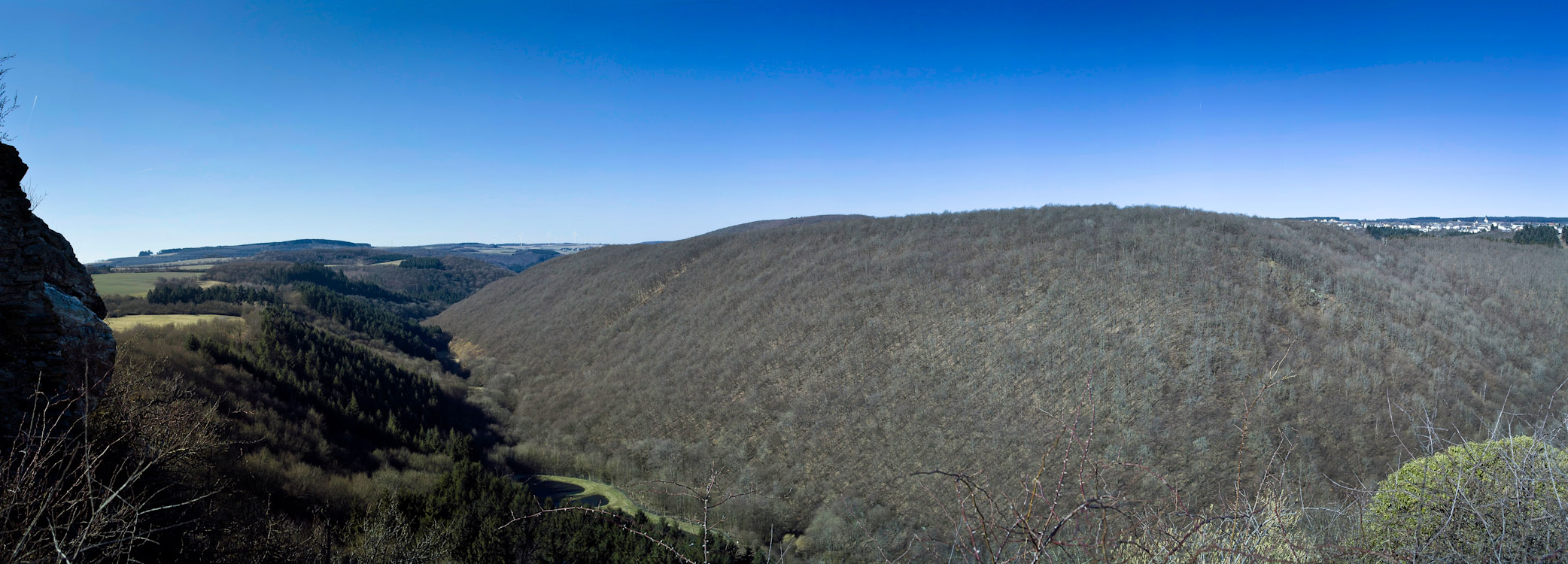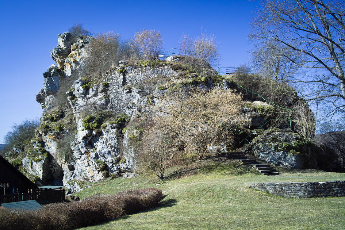 Utflukten førte oss opp i Huhnsrück, et langt høydedrag som går i øst-vestlig retning sør for Mosel. Det første stoppestedet var en stor borgruine, Burg Hunolstein. Selv om det i dag ikke er meget igjen av den, hadde borgen en gang en viktig stilling. Den er fra det 12. århundret. Men allerede under tredveårskrigen ble borgen så sterkt skadet, at den ble gitt opp allerede i 1637. Et interessant trekk ved borgen, var bruken av en kvartsklippe innenfor murverket.