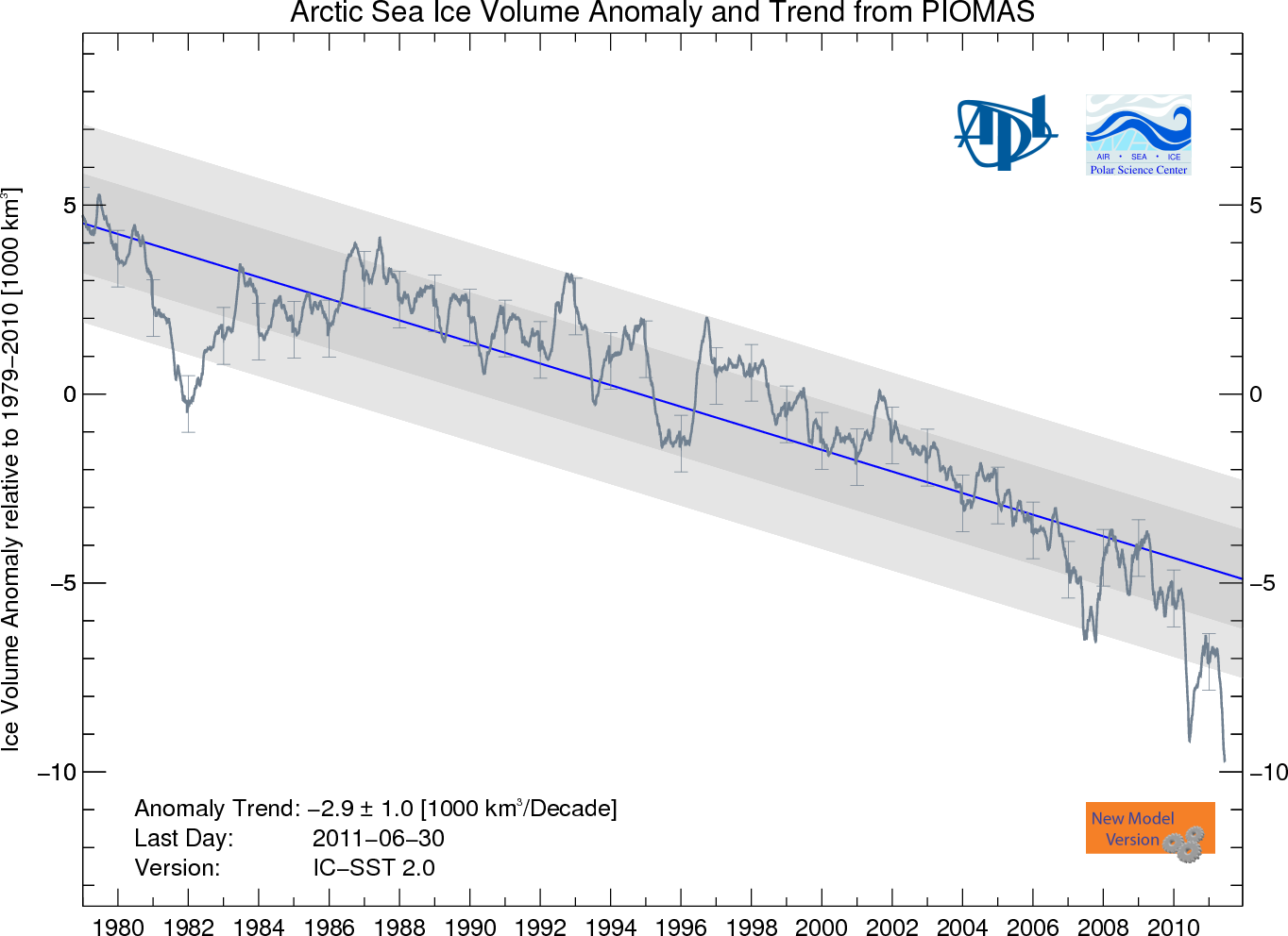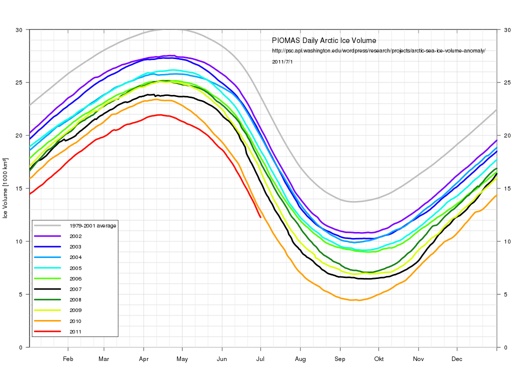 Den første kurven viser arealet av isen i Arktis ved siste måling i går. Akkurat i disse dager er den på vei til ny minimumsrekord. Den forrige ble satt i 2007. Men situasjonen til isen er ikke bare spørsmålet om overflaten. Riktignok er det en målestokk som er interessant i seg selv fordi det har med refleksjon av sollyset å gjøre. Men i og med at volumet også minker tydelig fra år til år, er det meget sannsynlig at overflaten vil forsette å minke i årene som kommer. En kurve som viser volumets utvikling: