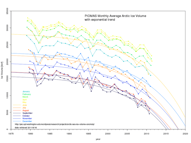 Her vises tydelig hvor fort isen forsvinner og trendkurvene er brukt for å vise hvor fort isen kan komme til å forsvinne helt, kanskje så tidlig som september 2015 eller 2016. September er måneden med minst is i Arktis.