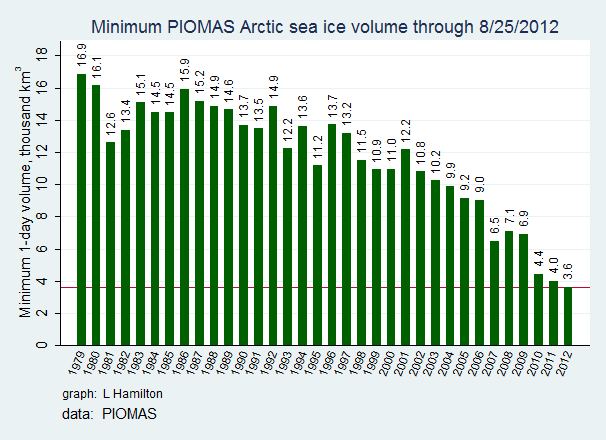 Men isen måles selvfølgelig ikke bare i flate, men også i volum. Her er den nyeste fremstillingen av volumet målt i tusen kubikkilometer per 25. august, dagen for ny rekord: