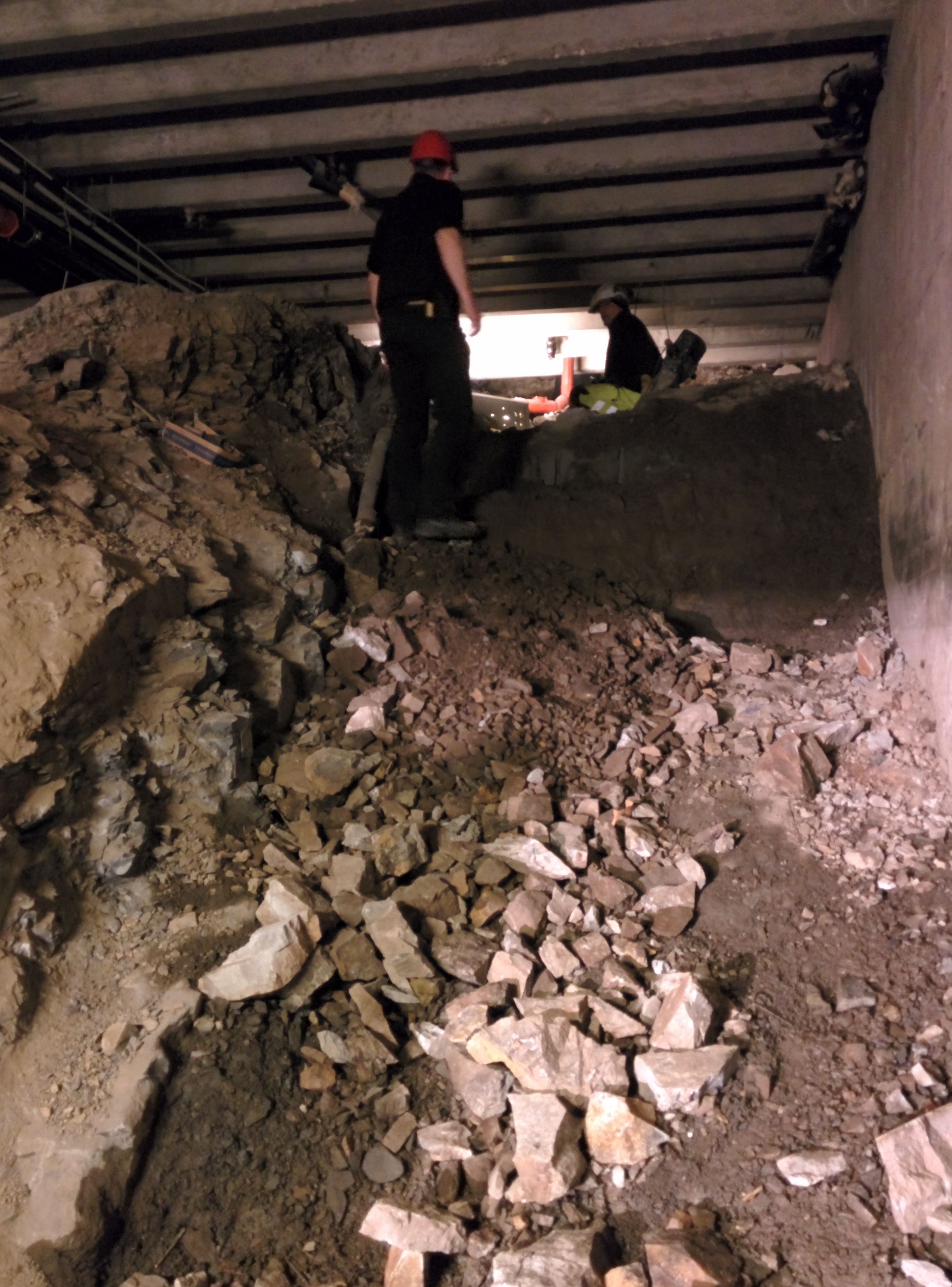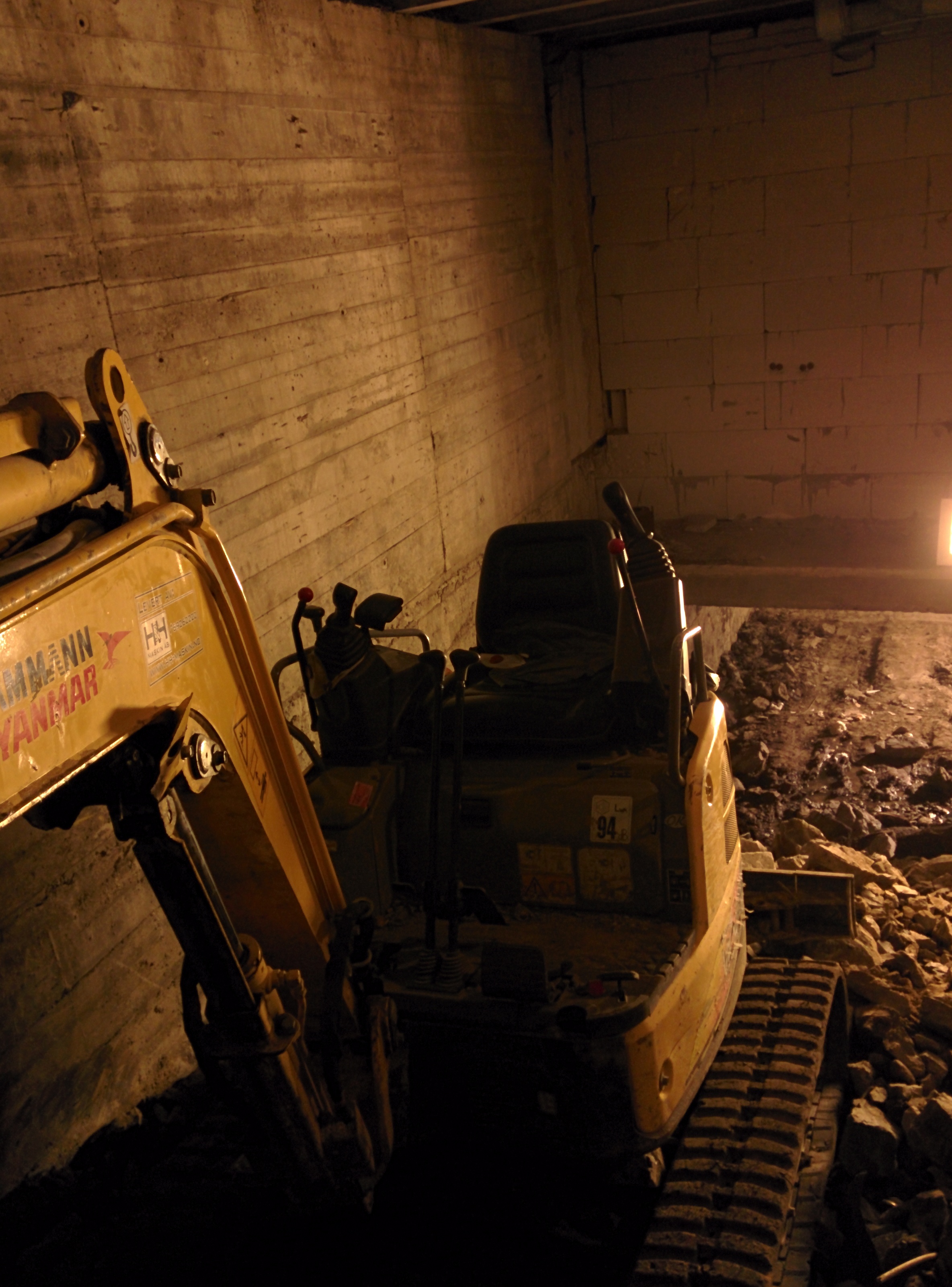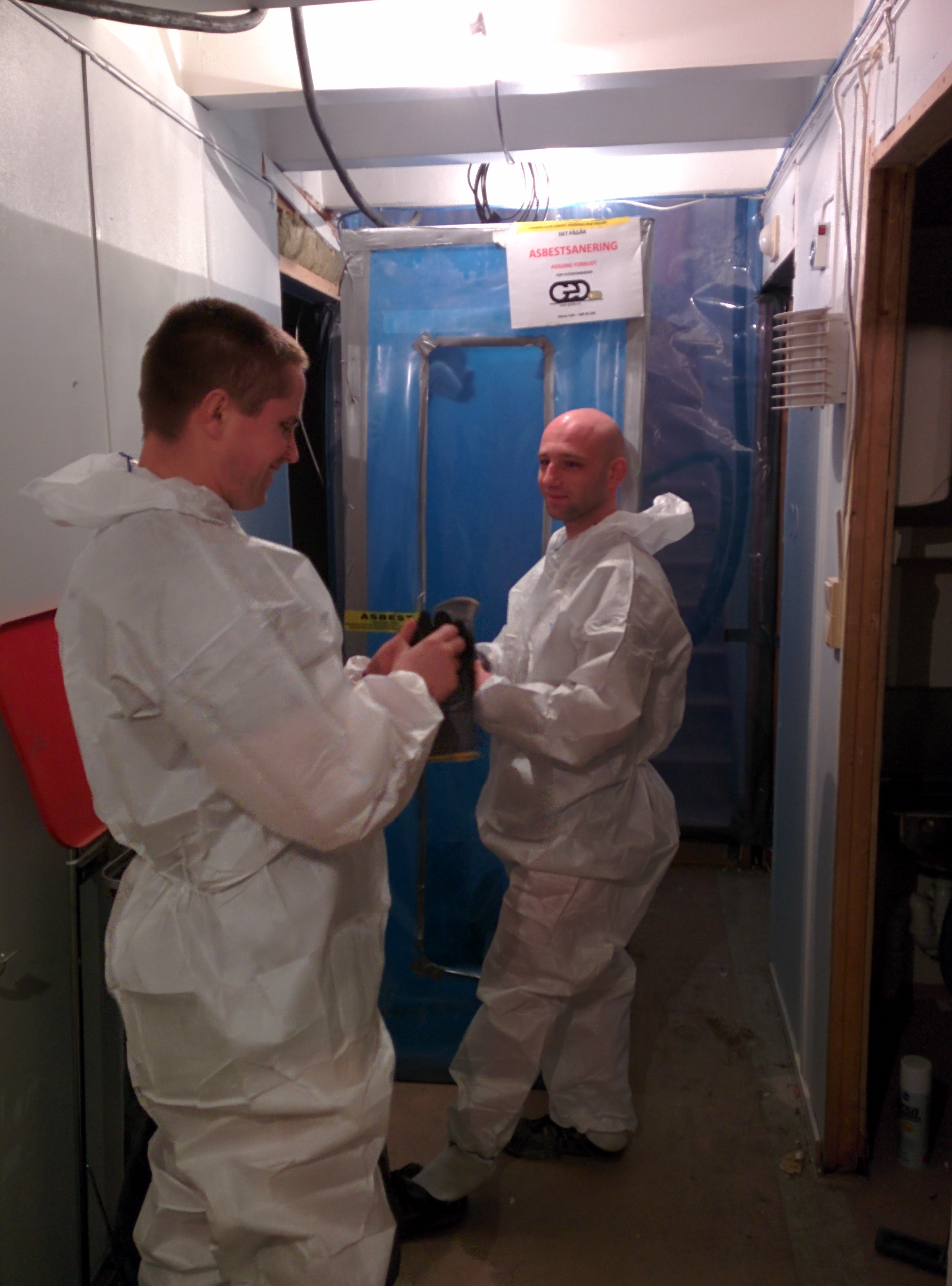 Da det viste seg at det var asbest i de gamle veggene inne, måtte de tas ut på forskriftsmessig måte. Det tok en måneds tid, avsluttet for rundt to uker siden. I kjelleren var det ingen asbest og der ble masse tatt ut for ventilasjonskanaler som kommer til å bli lagt under gulvnivå.