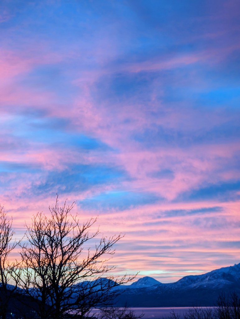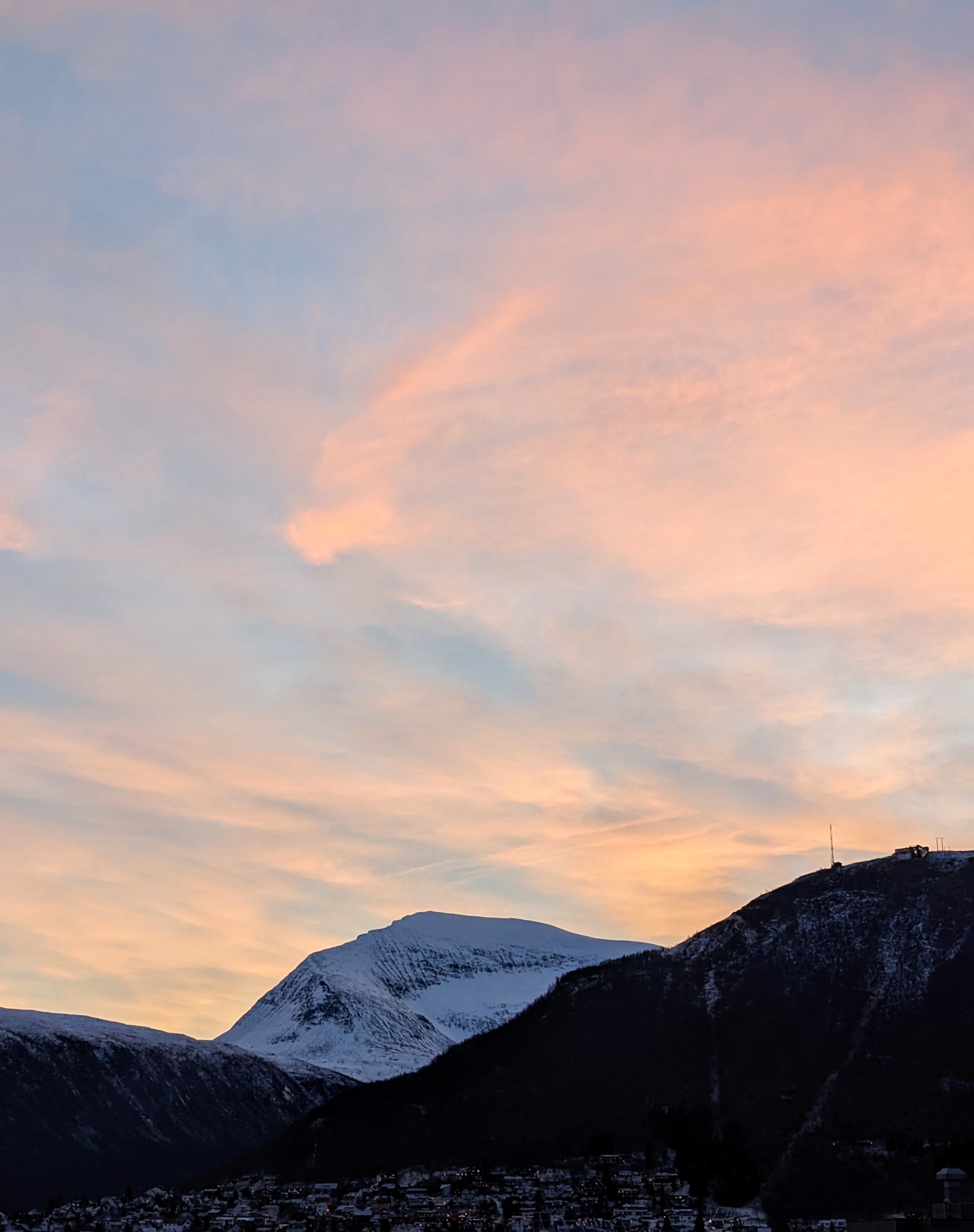 Da er vi kommet til det tidspunktet av året hvor solen holder seg under horisonten. Riktignok har den vært «borte» en stund grunnet fjellene i sør. Den kommer opp igjen den 15. januar, men kan ikke sees i byen før noen dager senere. Men selv om det er mørketid, er det lyst en stund midt på dagen. Det blir aldri helt natt hele dagen. Noen bilder fra i dag som viser solens refleksjon i skyene: