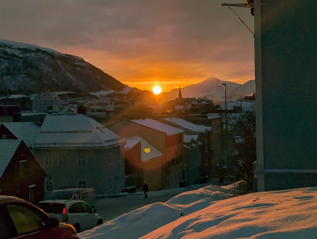 I dag fikk jeg endelig se solen for første gang i år. Riktignok steg den over horisonten den 15. januar, men grunnet fjellene, ser vi ikke solen før tidligst den 21. i byen. Men i går var det skyet i sør, så først i dag viste den seg. Så jeg måtte ta et bilde med telefonen. Ikke det mest optimale. Men bruker man telefonens kamera til et slik bilde, lønner det seg å peke med fingeren på det lyseste punktet, i dette tilfellet solen, slik at lysstyrken blir tilpasset. Etterpå gjorde jeg noen små justeringer i Googles fotoprogram i Chrome leseren.