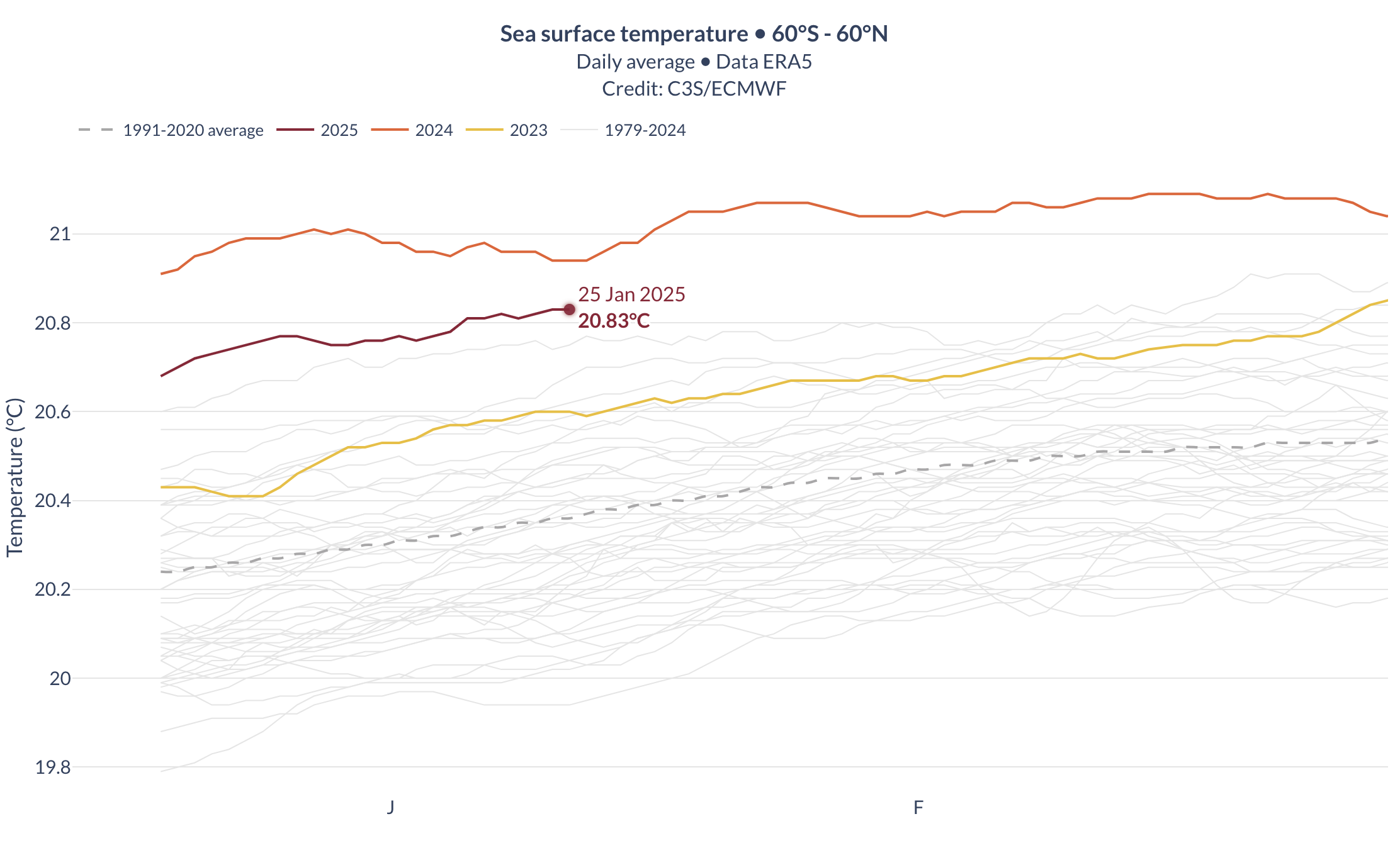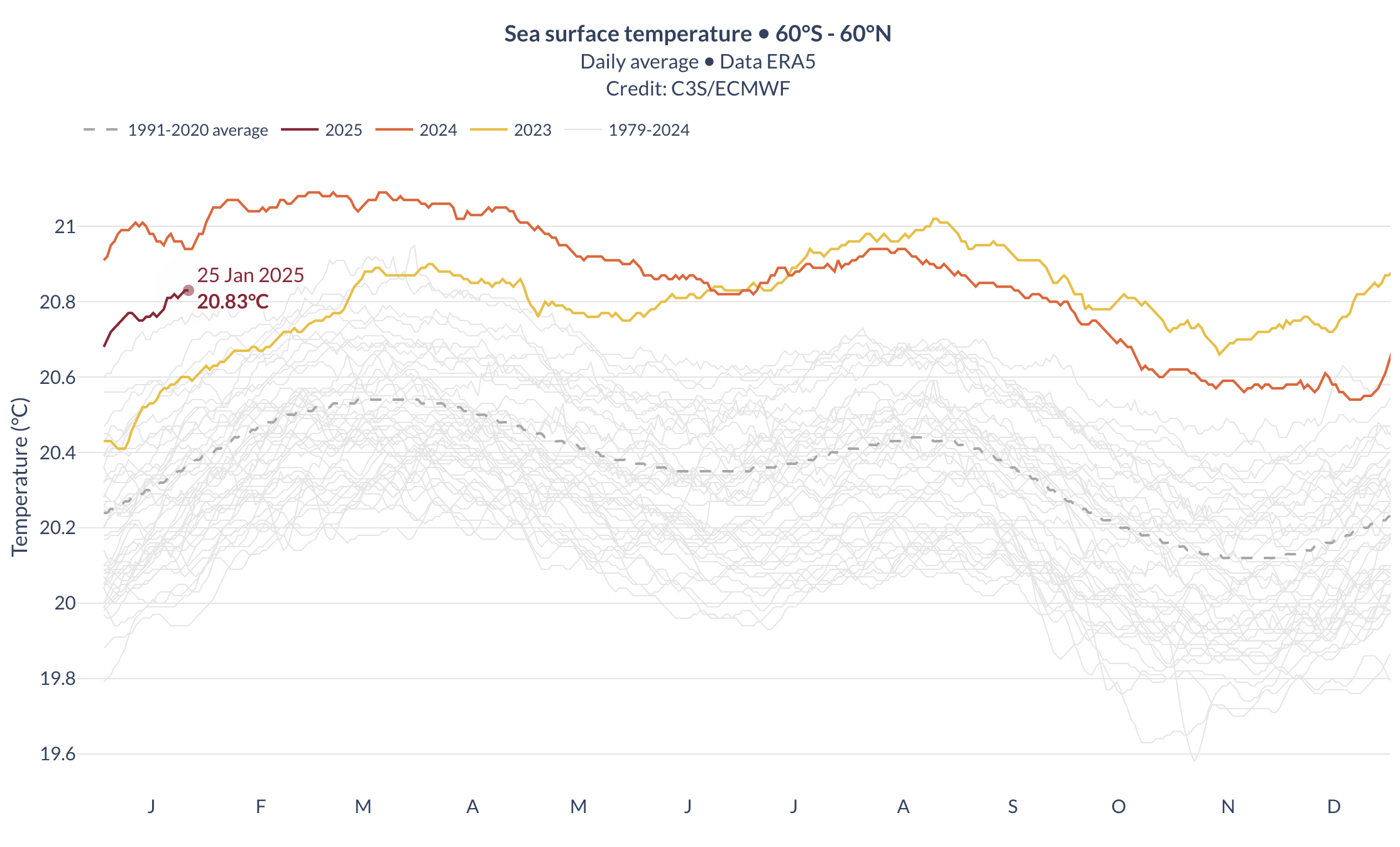 Først hav hvor det første bildet viser hele årsløpet. Vi ser at det nye året 2025 så langt er det nest varmeste i global havtemperatur. I kurven er 2024 oransje og 2023 gul. Det er tydelig at fra og med ute i mars 2023, har temperaturen nesten hele veien befunnet seg i nye områder: