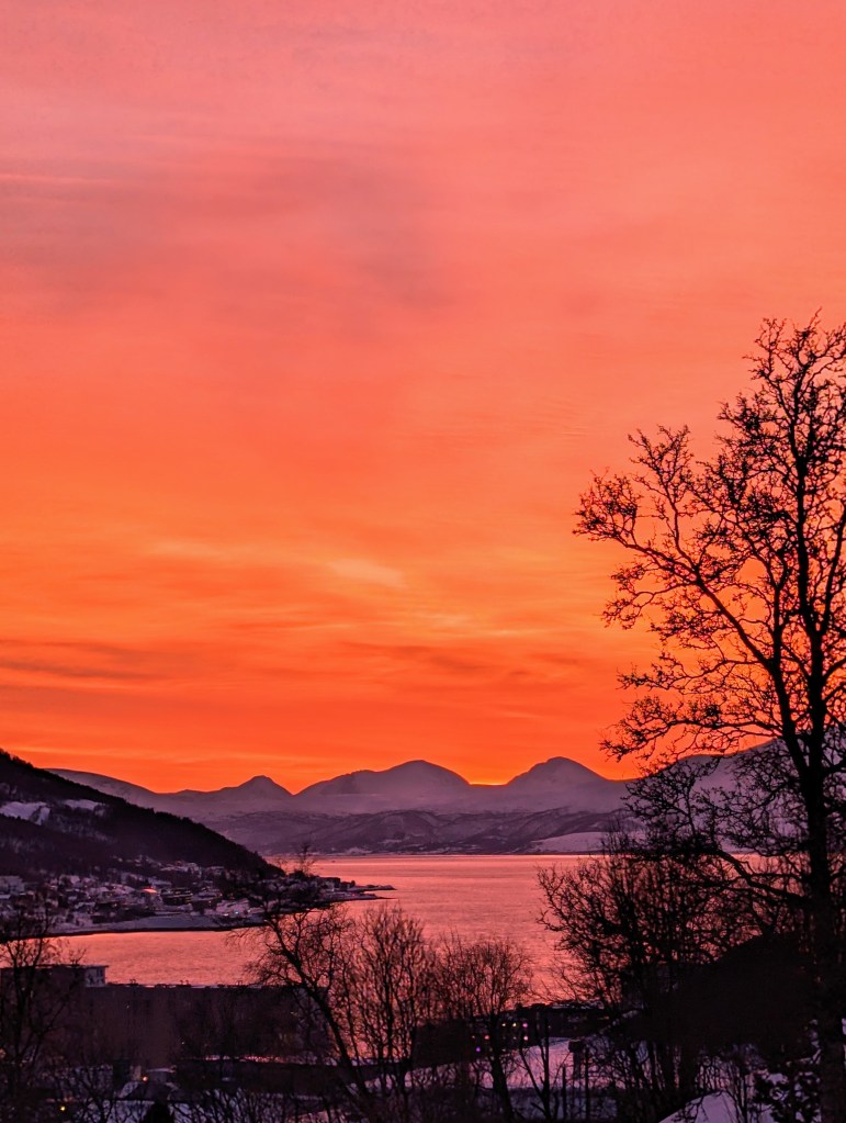Legger ved et bilde jeg tok nettopp med blikket sørover fra Tromsø. I dag er det knapt tre uker til solen atter kan skinne i byen om været tillater det.